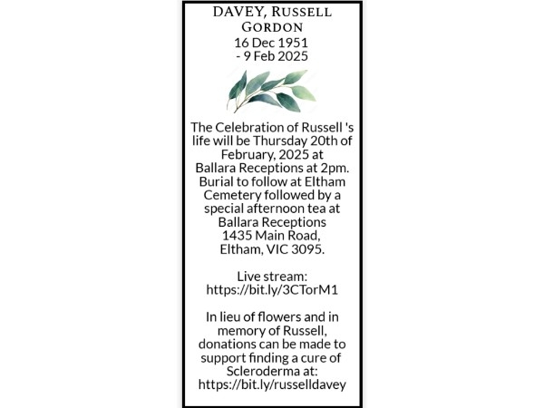 In memory of our beloved Russell Davey, we invite you to make a donation to the Australian Scleroderma Interest Group (ASIG), a subsidiary of St Vincent's Foundation in lieu of flowers. Your contribution will support vital research aimed at finding a cure for scleroderma, a rare and life-threatening condition that Russell fought with unwavering courage.